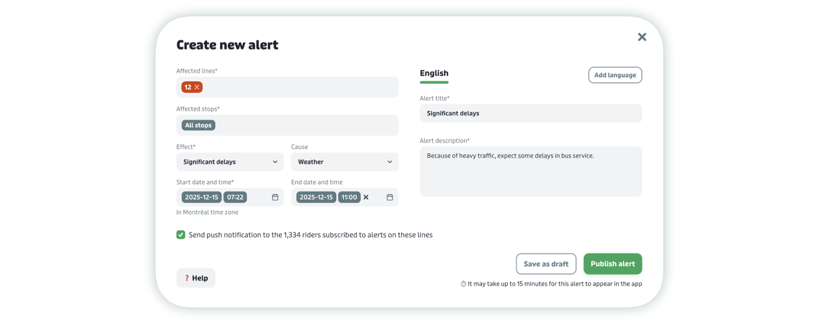 Our alerts tool, available in Transit Terminal, lets you quickly and easily notify riders about service disruptions, including stop closures, detoured or delayed routes, cancelled service, and significant delays.