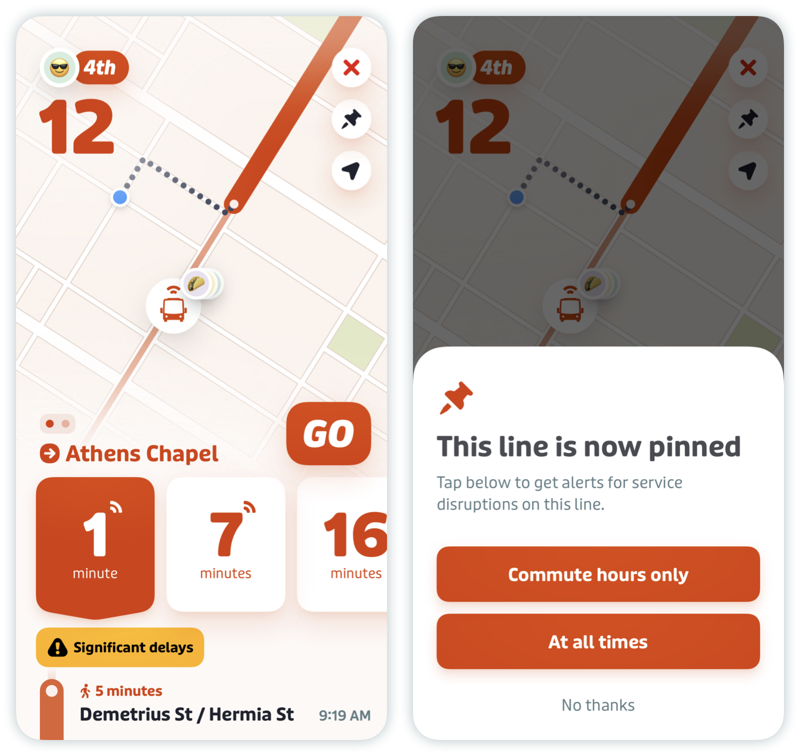 Easy! Riders can simply pin the transit line for which they’d like to receive service alerts. To do so, riders should select the relevant route and then tap the pin icon. Riders will then be prompted to select during which hours they’d like to receive notifications.