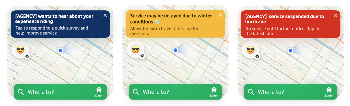 Transit's in-app banners communicate directly with your riders to inform them about major system changes, system-wide disruptions, or solicit feedback for occasional surveys.