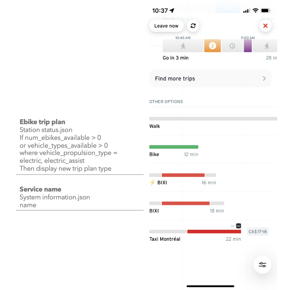 Transit ingests GBFS data for shared micromobility such as bikeshare, carshare, and scooters. Transit will display real-time availability of vehicles for both station-based and free-floating systems, including distinguishing between vehicle types (such as electric vehicles).