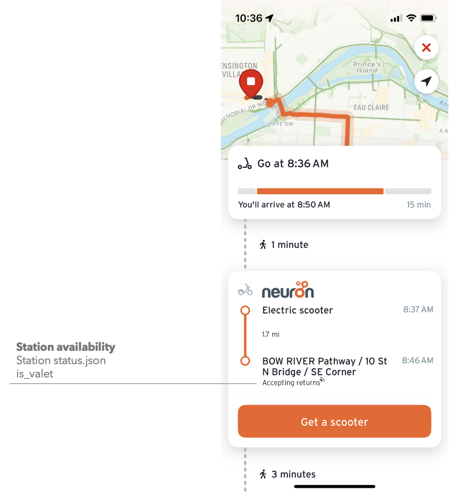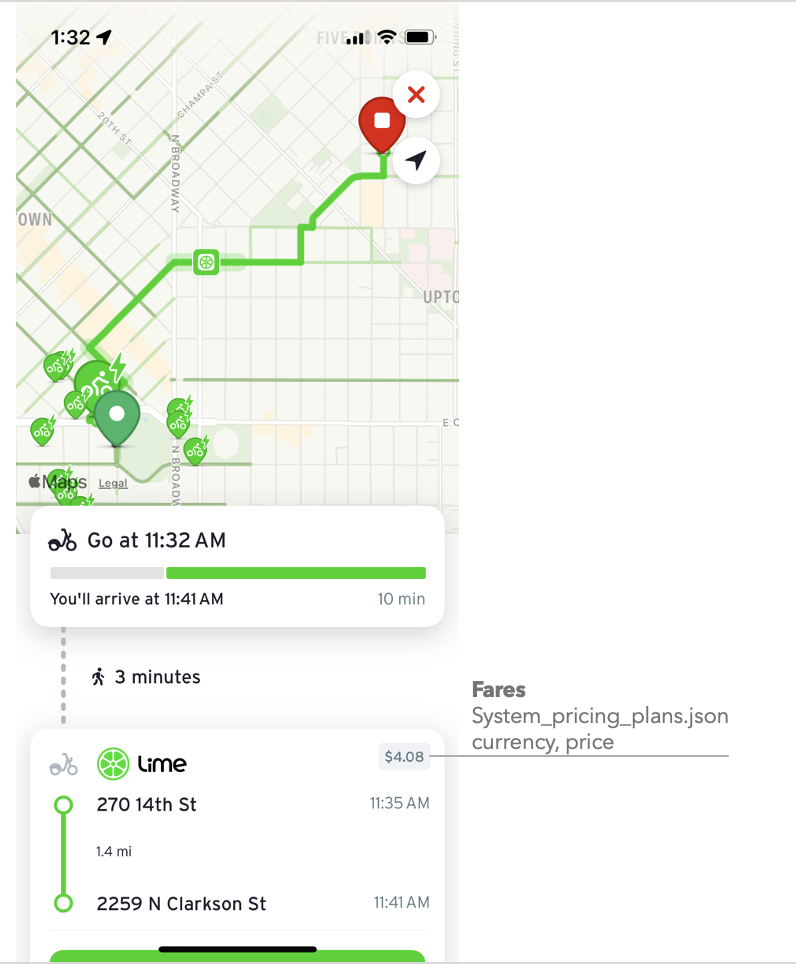 Transit will display the estimated battery level, costs to ride, and locations of scooters and bikes if available in the provider's GBFS. Transit will also link to the operator's app for the user to unlock and pay for their trip, if a universal link is available in the provider's GBFS.