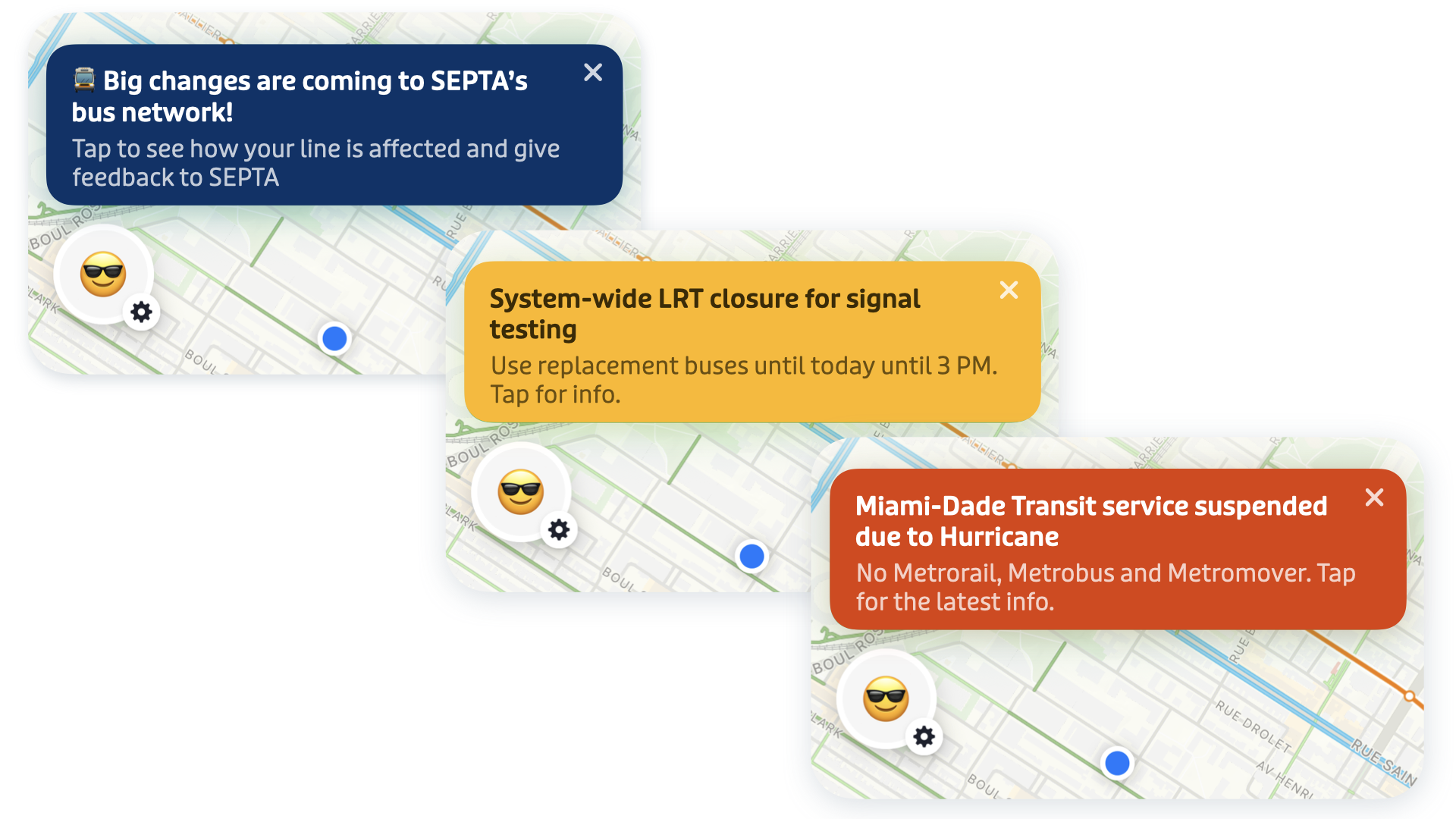 - Transit uses these alerts to reroute customers and display information in the app.